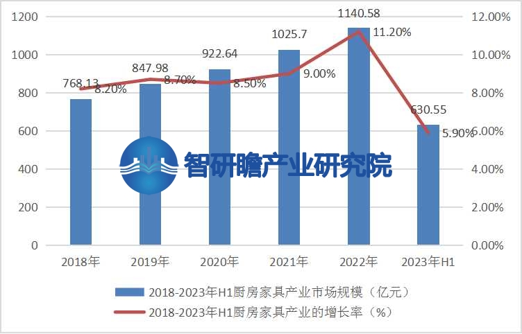 统计数据显示,2018年厨房家具产业市场规模为768.13亿元左右,2023年H1厨房家具产业市场规模为630.55亿元左右。2018-2023年H1厨房家具产业市规模数据分别为: