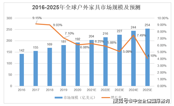 根据中金企信数据统计,2016年全球户外家具市场规模为142亿美元,2020年市场规模达到了192亿美元,2016-2020年全球户外家具市场规模的复合增长率为7.83%,并预计到2025年规模将达到254亿美元,市场规模呈现稳步上升的趋势,具体情况如下: