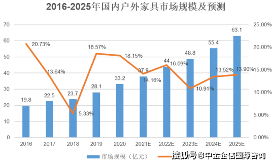 国内户外家具生产企业较多,大多数企业规模较小,主要分布在广东、江浙、上海等地区。2020年我国户外家具市场规模已达到33.2亿元,同比增长18.15%,增速高于全球户外家具市场。随着收入水平的提高以及生活理念的变化,国内户外家具市场空间进一步扩大,预计2025年行业市场规模将达到63.1亿元,具体如下: