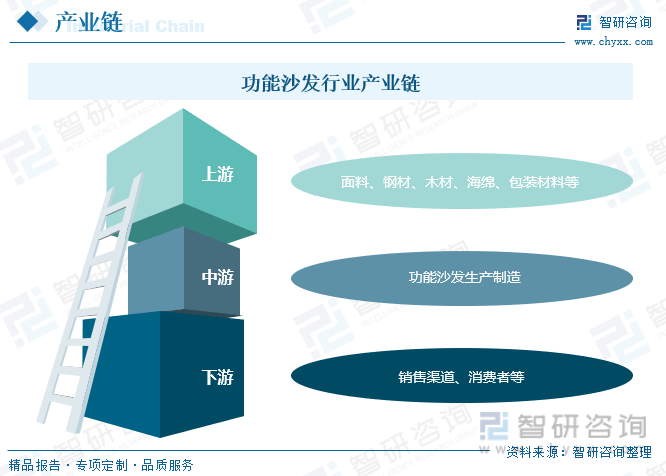 中国功能沙发行业上游市场参与者为原材料供应商,包括面料、钢材、木材、海绵及包装材料等供应商,中游主体为功能沙发生产商,下游涉及销售渠道和消费者,功能沙发产品通过家居卖场、商超百货、专卖店及电商平台等渠道销售给终端消费者。