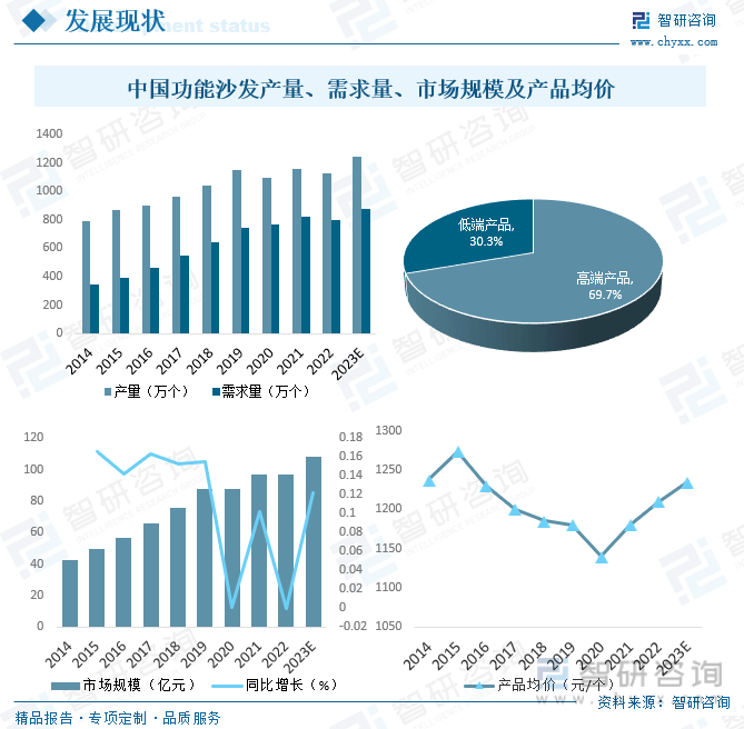 与成熟的欧美市场相比,中国功能沙发行业起步较晚,功能沙发产品在中国仍属于小众消费家居产品,但近年来,随着中国经济的持续发展及居民生活节奏不断加快,更多居民在消费过程中,更倾向于选择高舒适性的功能沙发,2021年中国功能沙发产量达1160.9万个,其中,高端产品占比高达69.7%,低端产品仅占30.3%,同年需求量达820.1万个,市场规模达96.77亿元,2022年受下游市场需求减少叠加疫情影响,作为全球主要沙发生产国,中国功能沙发产销量、产业规模均有所下滑,随着功能沙发市场在中国市场的渗透率不断攀升,未来中国功能沙发市将恢复增长趋势,预计2023年中国功能沙发需求量将达到878.8万个,市场规模有望突破120亿元。从产品价格来看,随着欧洲地区的需求放缓,国内市场的需求大幅增加,国内功能沙发市场竞争加剧,加之产销量的扩大,行业生产成本总体呈现出明显的下降态势,市场价格也持续下降,2020年价格降幅有所扩大,约为1140元/个,随着消费升级,中高端产品尤其是高性价的真皮沙发仍有很大的发展空间,未来中国功能沙发产品价格将持续提升,预计2023年将增至1235元/个。