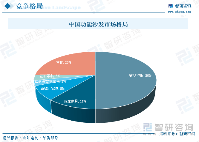 功能沙发作为生活、办公家具的重要品种之一,市场空间巨大,由于行业门槛较低,参与市场竞争企业众多,多数企业经营规模不大且研发设计能力较弱,仿制现象较严重,存在一定程度的同质化竞争。目前,在中国功能沙发市场上,占有市场份额比较大的竞争者为敏华控股、顾家家居、夏图集团、富丽家具、Natuzzi集团,敏华控股市场占有率独大功能沙发市场,遥遥领先排名第二的顾家家居,顾家家居通过与美国厂商La-Z-Boy合作设计功能沙发产品,接下来夏图集团、富丽家具、Natuzzi等,目前国内功能沙发市场已形成一超多强的市场格局,行业集中度较高。