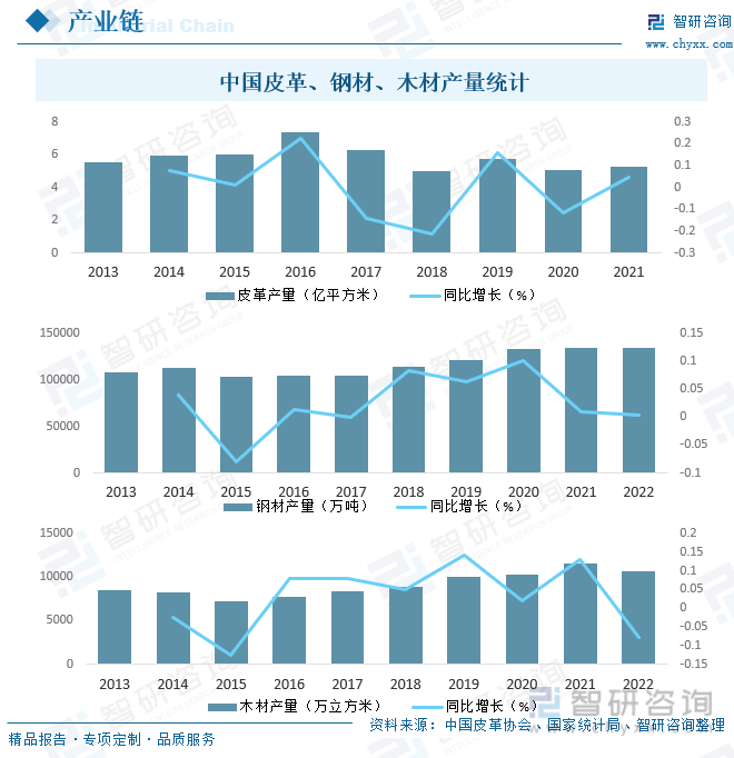 中国功能沙发产业链上游市场参与者为原材料供应商,为中游功能沙发生产商供应面料、钢材、木材、海绵及包装材料等原材料,在众多原材料中,面料、钢材、木材及海绵需求量较大,2021年中国皮革产量达5.29亿平方米,2022年中国钢材产量完成134033.5万吨,木材产量完成10693万立方米,中国功能沙发上业发展较为成熟稳定,不存在原材料短缺的问题。