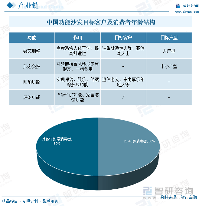 中国功能沙发行业下游涉及销售渠道和消费者,销售渠道方面,功能沙发产品仍以线下渠道为主流渠道。消费者层面,在功能沙发的消费者中,25岁至40岁消费者最多,占比超过50%。功能沙发消费群体呈现年轻化的趋势,80后、90后已是功能沙发消费的绝对主力,其中又以商务人士和白领居多。现阶段,功能沙发越来越契合家具消费者的需求,功能沙发渗透率不仅上升空间大,而且上升动力足,未来随着消费者对功能沙发购买的意愿和能力持续提升,功能沙发市场规模有望维持高增。