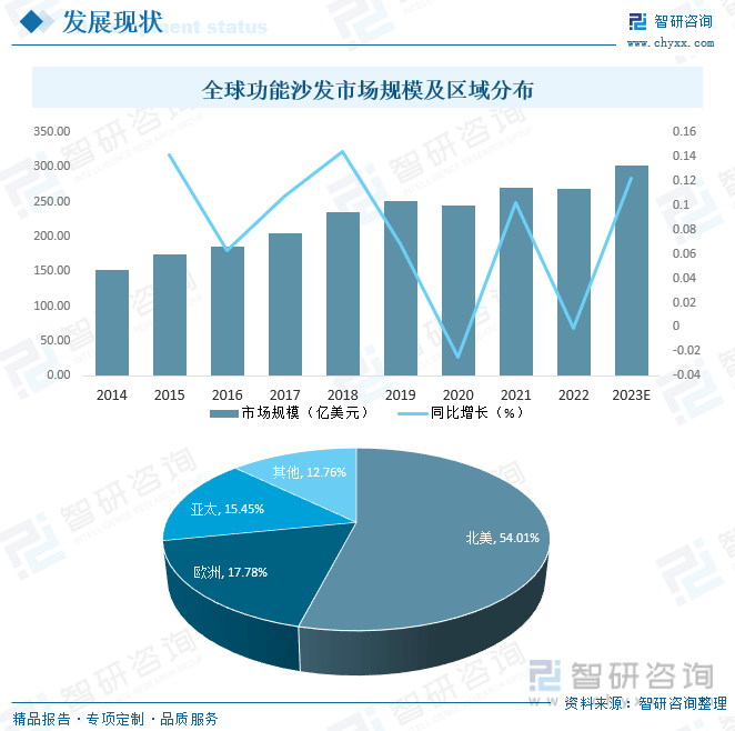 沙发作为工作、休憩、娱乐的主要工具,可有效缓解疲劳,是居民生活的必需品,随着科技的进步及居民收入水平不断提高,居民消费不断升级,消费者对于沙发的诉求不再限于作为简单的坐具,对沙发的健康性、舒适性和功能性提出了更高的要求,功能沙发凭借其高舒适性、多功能性备受消费者青睐,2021全球功能沙发市场规模增至269.74亿美元,2022年降为269.49亿美元,2021年开始恢复增长,预计2023年全球功能沙发市场规模有望突破300亿美元。从区域分布来看,目前,北美是全球功能沙发的最大消费国,占比高达54.01%,由于欧洲地区经济增速放缓影响,以及近些年亚太地区功能沙发市场发展增速突出,亚太地区功能沙发市场规模占比与欧洲地区差距逐渐缩小。