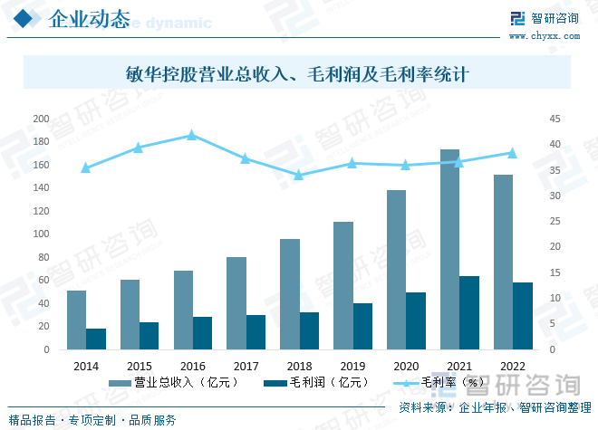 敏华控股有限公司自1992年诞生于香港,敏华始终专注沙发、床垫及智能家居领域,先后在新加坡和香港上市,2017年,敏华市值突破三百亿港元,位居全球家居上市公司市值前列,并率先入选沪港通和恒生指数成分股,成为集研发、制造、销售和服务于一体的大型跨国智能家居企业。作为全球实力雄厚的功能沙发、床垫等家具供应商,敏华拥有现代化的制造和物流体系,并在中国广东、江苏、天津、重庆、北欧波兰、立陶宛、爱沙尼亚、乌克兰以及亚洲越南建立十二大生产制造基地,为全球消费者带来健康、舒适、超值、时尚的家居。2022年敏华控股营业总收入完成151.9亿元,毛利润58.46亿元,毛利率为38.49%。