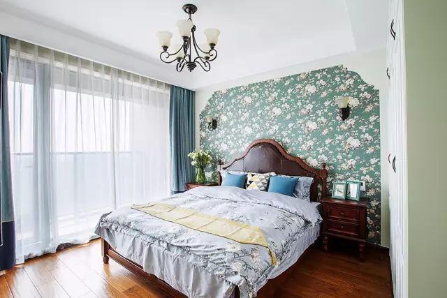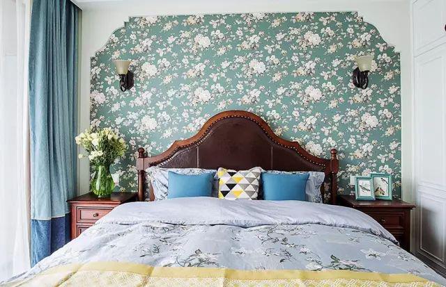 主卧的背景墙同样采用了碎花壁纸,但颜色与客厅有所不同,营造出了一种别样的温馨氛围。