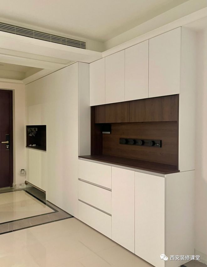 如图所示的做法,没有吊顶,就会导致上部分厚重,有头重脚轻的感觉,如果上缩吊柜,中间加上镂空或者隔板的话,就可以解决这种不协调的问题