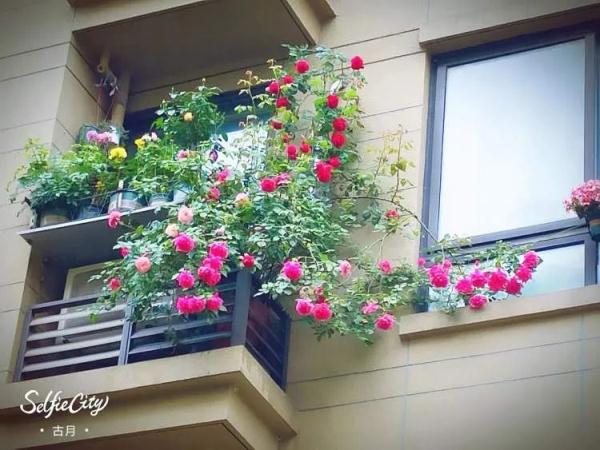胡女士家的阳台有着类似的景观:南北2个阳台外都种了藤本月季品种,它们横向、纵向不断攀爬,从一个阳台爬到另一个阳台,不断扩张着地盘,也不断创造着美景。