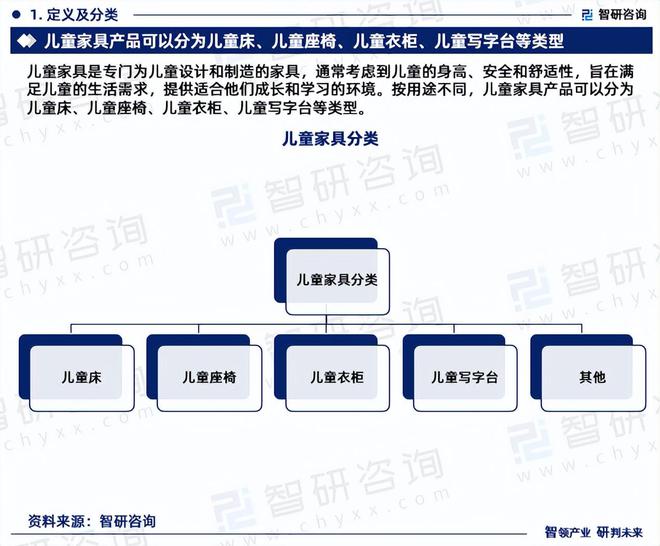 儿童家具是专门为儿童设计和制造的家具,通常考虑到儿童的身高、安全和舒适性,旨在满足儿童的生活需求,提供适合他们成长和学习的环境。按用途不同,儿童家具产品可以分为儿童床、儿童座椅、儿童衣柜、儿童写字台等类型。