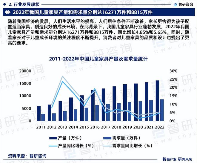 随着我国经济的发展,人们生活水平的提高,人们居住条件不断改善,家长更舍得为孩子配置适当家具,创造良好的成长环境,在此背景下,我国儿童家具行业蓬勃发展,2022年我国儿童家具产量和需求量分别达16271万件和8815万件,同比增长4.85%和5.65%,同时,随着家长对于儿童成长环境的关注程度不断提升,消费者对儿童家具的品质和设计也提出了更高的要求。