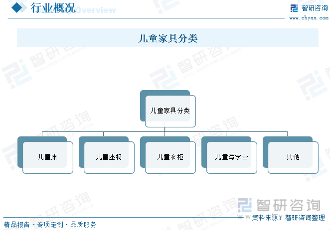 儿童家具是专门为儿童设计和制造的家具,通常考虑到儿童的身高、安全和舒适性,旨在满足儿童的生活需求,提供适合他们成长和学习的环境。按用途不同,儿童家具产品可以分为儿童床、儿童座椅、儿童衣柜、儿童写字台等类型。