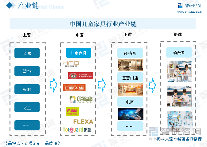 儿童家具生产原材料主要包括金属件、塑料件、板材、包装材料、布及泡棉等,因此儿童家具行业上游主要包括金属行业、塑料行业、板材行业、化工行业等行业,上业在国内发展较为成熟,呈现充分竞争的beat365官网格局,供应情况稳定。儿童家具成品通过经销商、直营门店、电商等线上线下销售渠道,最终到达消费者手中。