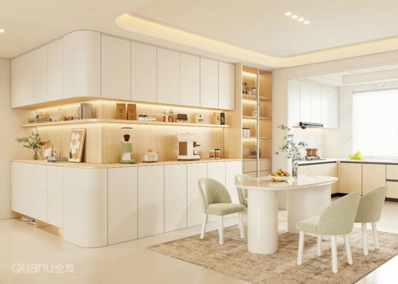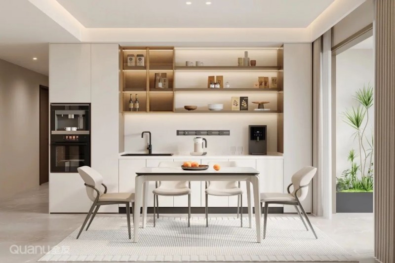 生活动线越短,效率就越高。将咖啡机、水壶等小型电器外移至餐厅后,相应的杯具也存放在餐边柜内,既避免了油污、水渍,减少清洁频率,在日常饮水、泡茶、喝咖啡时也不用再反复进出厨房,缩短了生活动线,提高居家舒适度。