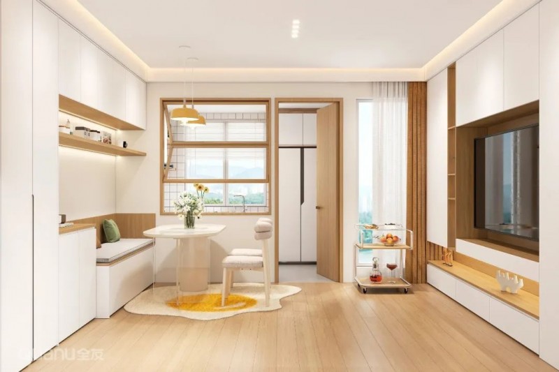 利用转角优势,将餐边柜和玄关柜做一体式设计,中部留空,方便随手置物的同时,放置小型电器也无需顾虑,动线流畅,整体性更强。