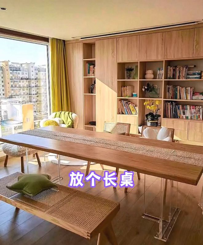 可以设计的形式太多了,打破固有的三间套模式,客厅的设计可以很多样化,去掉茶几,放个长桌可以满足更多样的需求。
