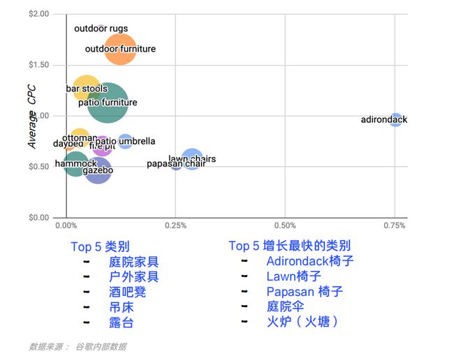 各式的户外椅子搜索增长较快,其中 Adirondack Chair是搜索增长最快的 产品,其次是Lawn Chair 和Papasan Chair。庭院家具和户外家具是搜索量最大的 品类,其次是酒吧凳、吊床和露台。