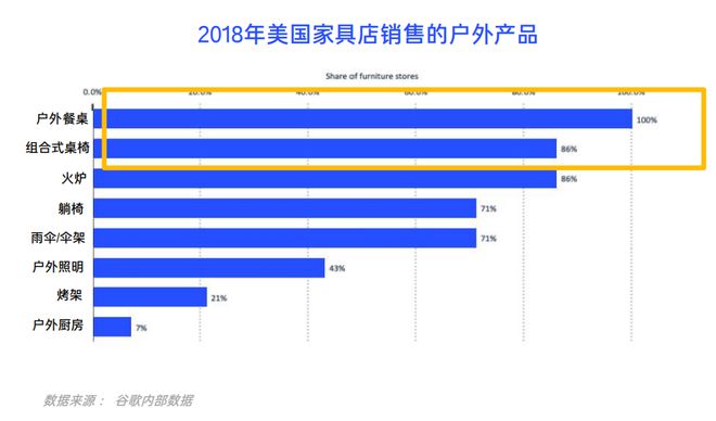 美国用户热衷于户外聚餐,餐桌 是必不可少的产品,餐桌类产品 零售份额占据48%位居榜首 ,Chat group和遮阳类产品作为户外 辅助家具产品分别占据了25%和 13%的市场份额。