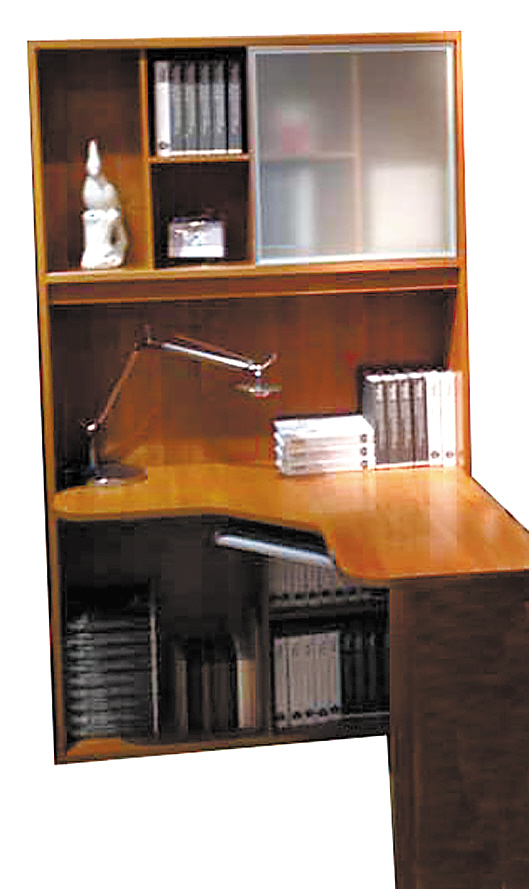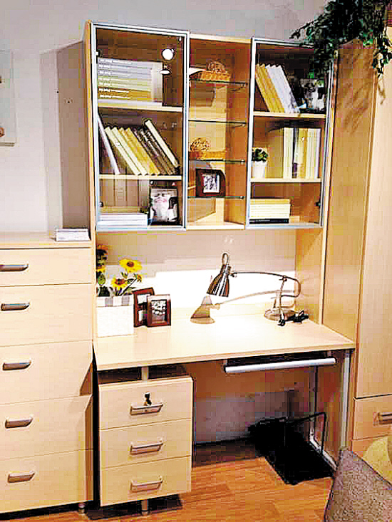 转角设计充分利用居室角落的狭小空间,坐在电脑桌边能轻松取用柜里的书籍,简约且方便。
