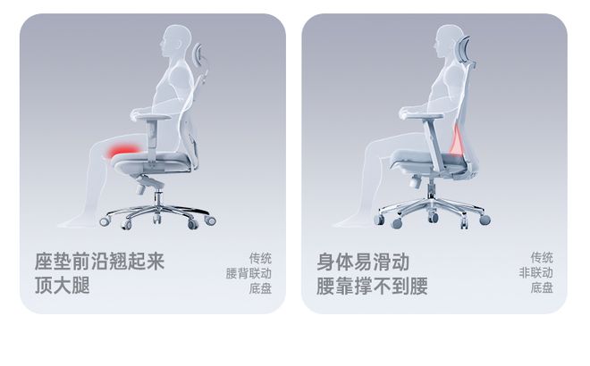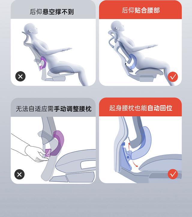 而在底盘之外,扶手和腰背系统某种程度上与底盘是相辅相成的关系,就像前面提到的西昊多米诺系统,就是一个腰靠与底盘联动结构。可以根据人体的姿势变化自动追踪腰部位置,在不同姿势下持续提供支撑力,确保人体的压力被分散到椅身和网布上。