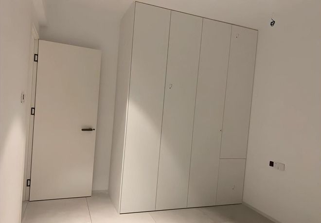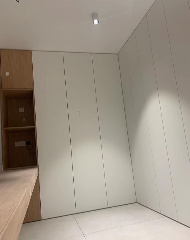 此次卧内,衣柜与浴柜皆以纯白呈现,营造出清新脱俗的洁净氛围。空间虽紧凑,却预留了床位的完美融入,届时布置妥当,余裕或显局促。而衣柜直抵天花的设计,不仅最大化储物空间,更添一份大气与利落感,尽显设计巧思。