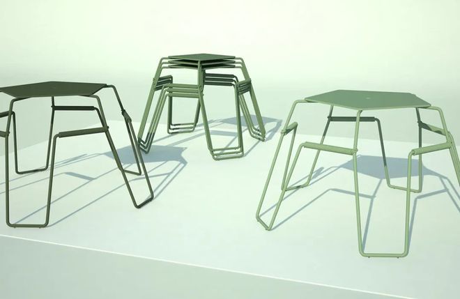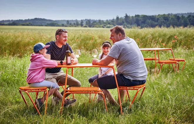 MUSELET 野餐桌,由建筑师 Pavla beat365平台Tylichová 设计。这些微妙、俏皮的弯曲钢管整体带有绳索编织座椅,色彩丰富可供选择,在视觉上跟随我们的鸡尾酒桌,并保留了其可堆叠性和稳定性等优势,而无需锚固。